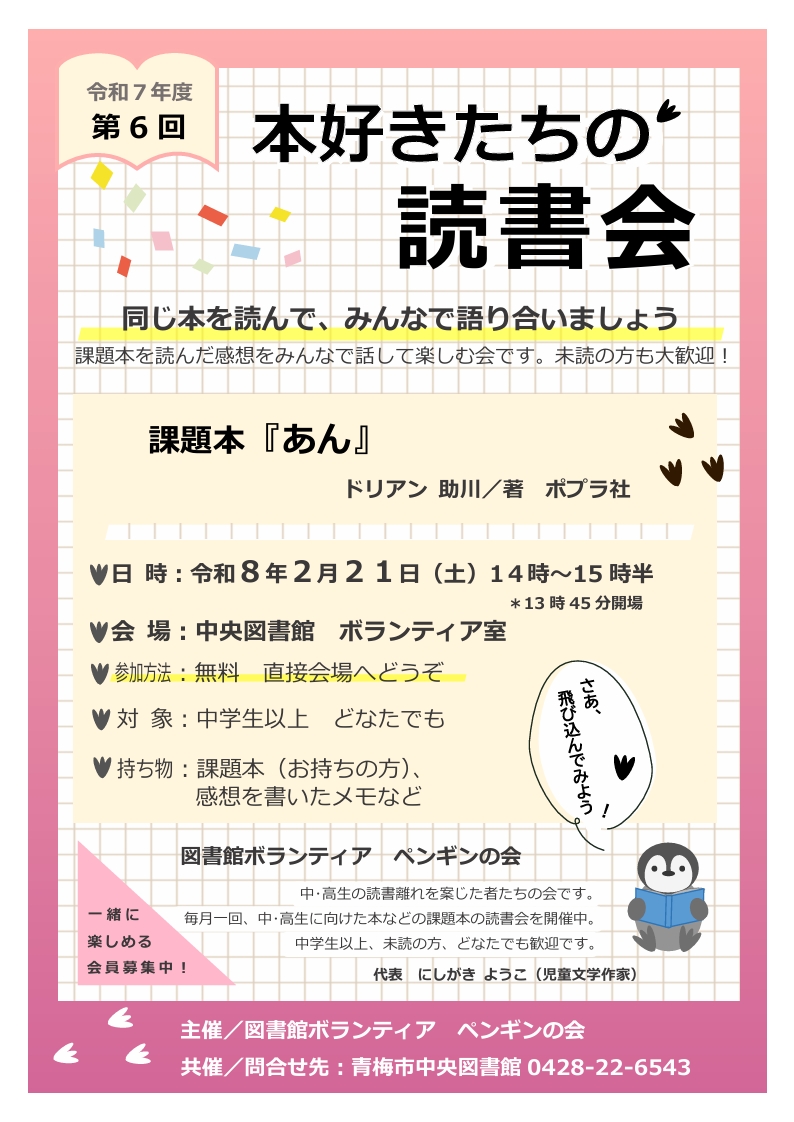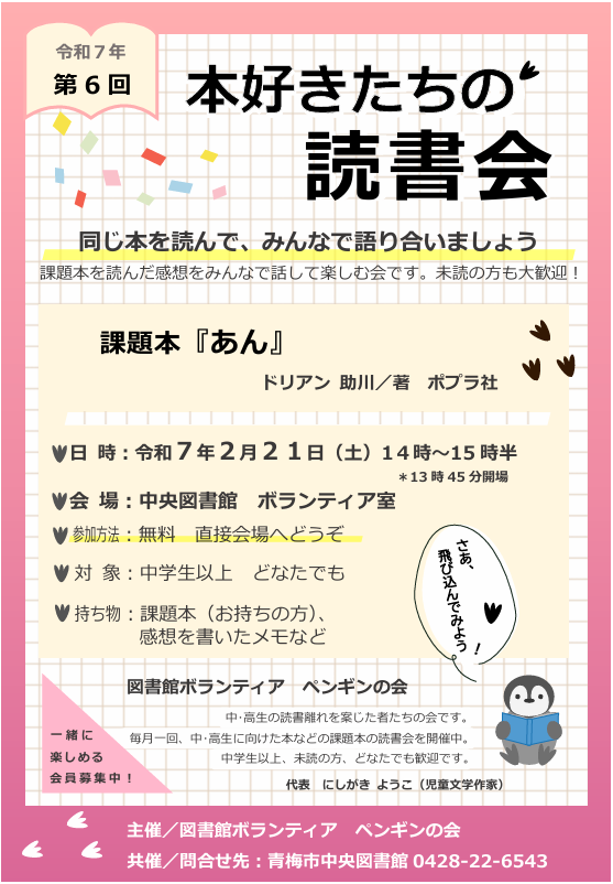 | 詳細内容 | 【同じ本を読んで、みんなで語り合いましょう!】 あらかじめ決められた課題本を読み、読んだ感想をみんなで話し合って楽しむ会です。 一冊の本を通して読書の楽しみを再発見してみませんか! 未読了の方や当日の飛び入り参加も大歓迎! 令和7年度第6回課題本 『あん』 ドリアン助川/著 ポプラ社/出版 参加方法:直接会場へお越しください。 持ち物:「課題本」(手元にある方)、感想を書いたメモなど 主催:図書館ボランティア「ペンギンの会」 共催:青梅市中央図書館 |