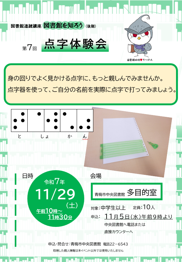 図書館連続講座『図書館を知ろう』 第7回「点字体験会」 中央