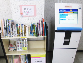 カウンター前には靴を脱いで親子でゆっくり絵本を楽しめるコーナーがあり、おもちゃでもご自由に遊んでいただけます。棚の上には「きせつのえほん」を展示しています。