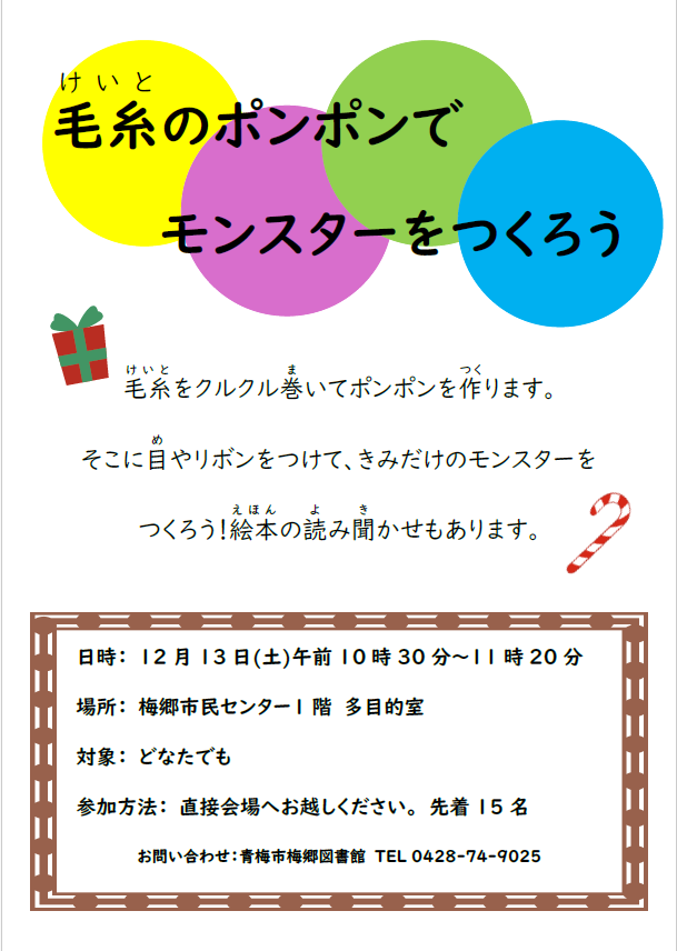 梅郷図書館ワークショップ「うめこの時間」毛糸のポンポンでモンスターをつくろうについて